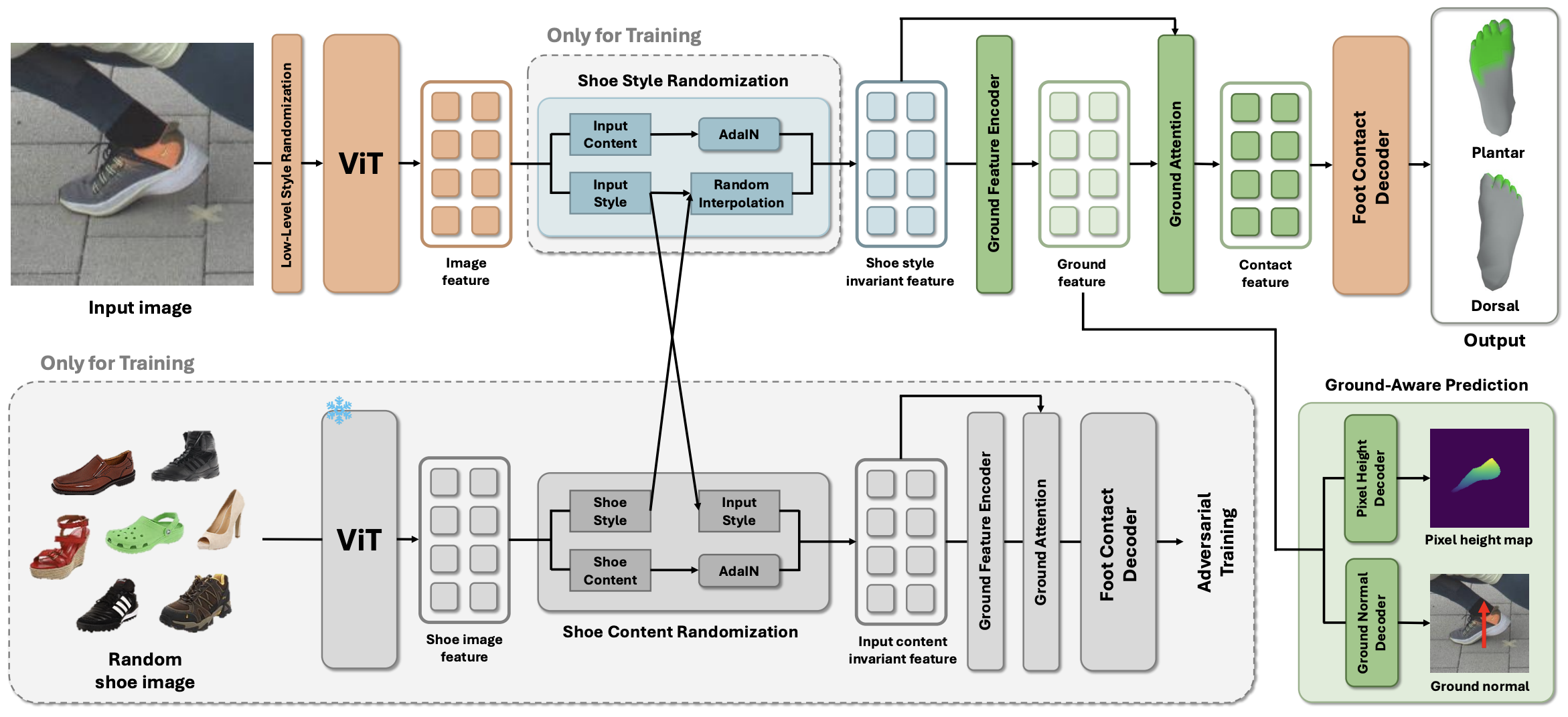 Our method first applies low-level style randomization on input image and encodes it into image feature using a ViT backbone. From image feature, shoe style and shoe content randomization are performed with random shoe images from the UT Zappos50K dataset to produce a shoe style-invariant feature. This feature is then processed by a ground feature encoder to extract ground feature, which is used to predict pixel height map and ground normal. Finally, the ground feature and shoe style-invariant feature are fused to form a contact feature, which is decoded to produce the final foot contact prediction.